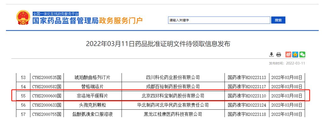 2022年3月8日,根据国家药监局发布公告,公司的非洛地平缓释片正式获得国家药监局批准上市。